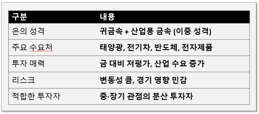 즉, 은은 보수적인 자산이라기보다 공격적인 포지션의 대체자산에 가깝습니다.