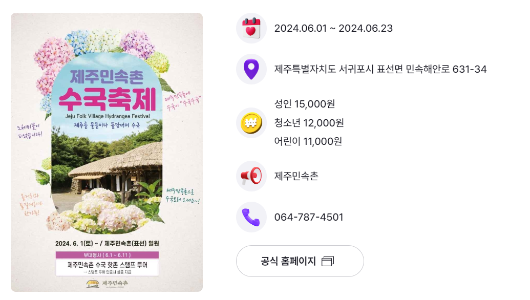 - 제주 민속촌 제주 수국 축제 기간 : 2024.06.01 ~ 2024.06.23
